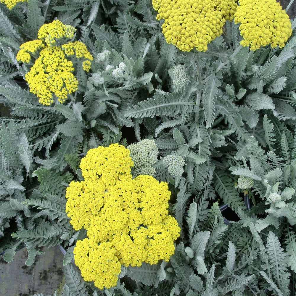 Upright, feather-grey foliage topped with sulfur yellow, flat-topped flower clusters; blooms summer to fall.