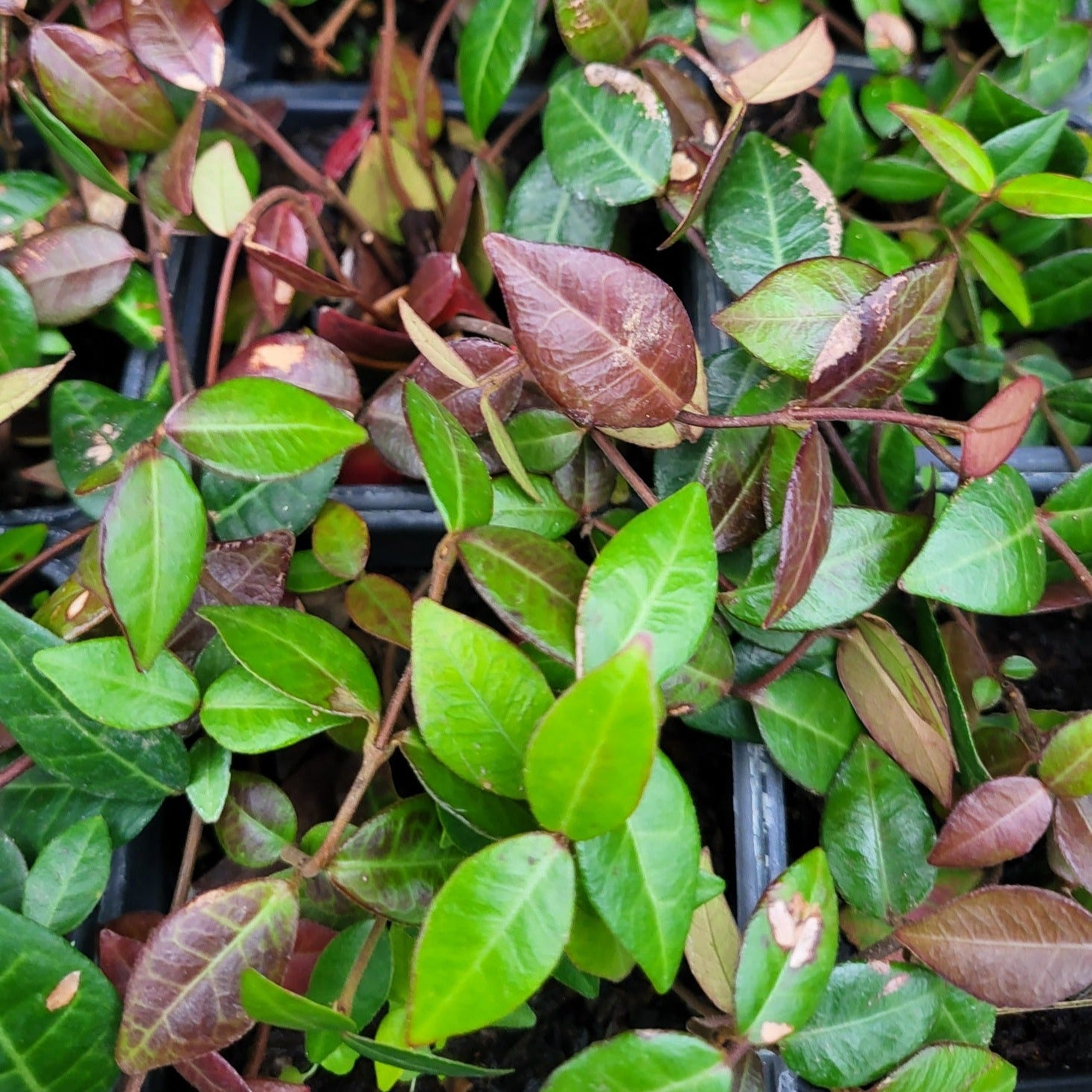 Glossy green, vine-like foliage, small white flowers when mature; good for borders, banks and slopes.