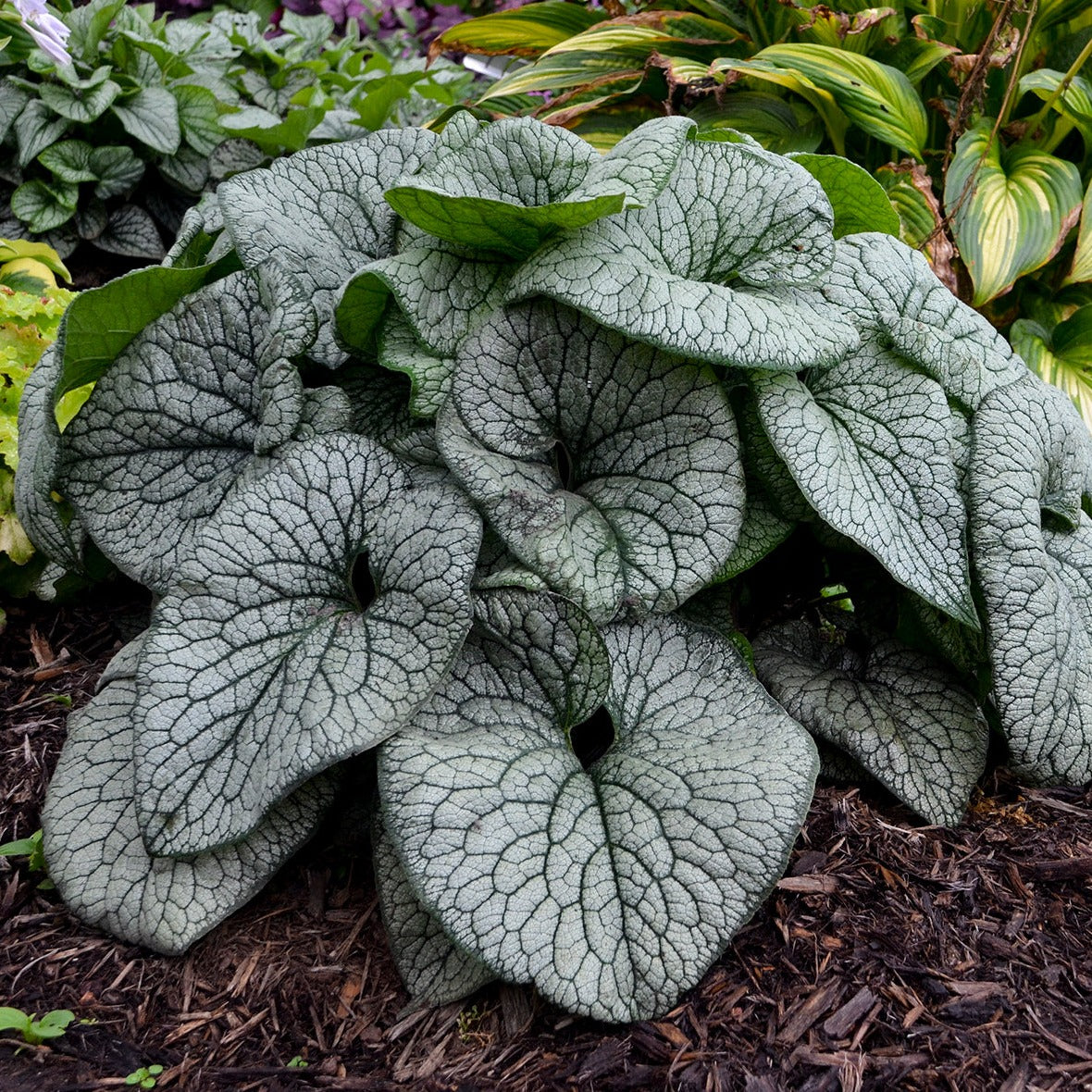 Heart-shaped leaves with a pronounced silver overlay lowlighted by bands of dark green veining. Clusters of blue blossoms are held in clusters above the foliage from mid to late spring.