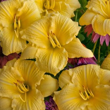 An improved 'Happy Returns': larger, canary yellow, fragrant flowers, nearly continuous bloom starting in early summer.