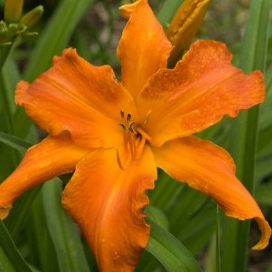 Spectacular 7.5-8.5" glimmering tangerine orange, gold-dusted blossoms with a green throat appear in midsummer on willowy scapes.
