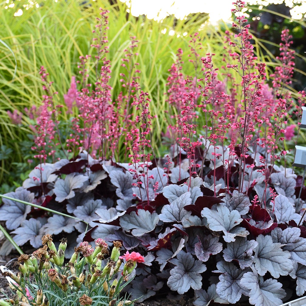 A Heuchera villosa hybrid featuring silver iridescent leaves with a semi-gloss finish. Vibrant pink flowers.