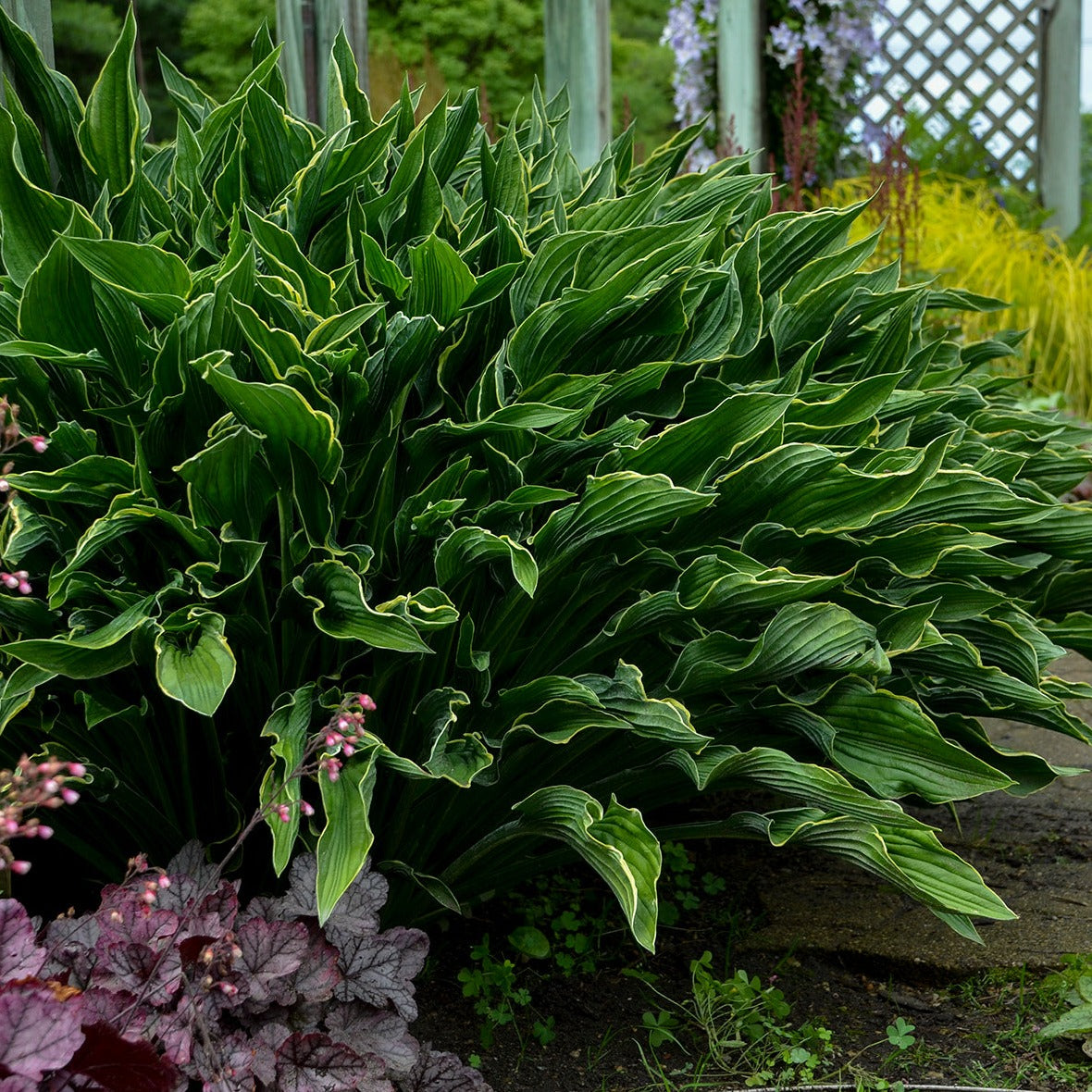 Upright, narrow, rippled, tightly folded, dark green leaves with gold margins resemble praying hands. Lavender flowers in late summer.